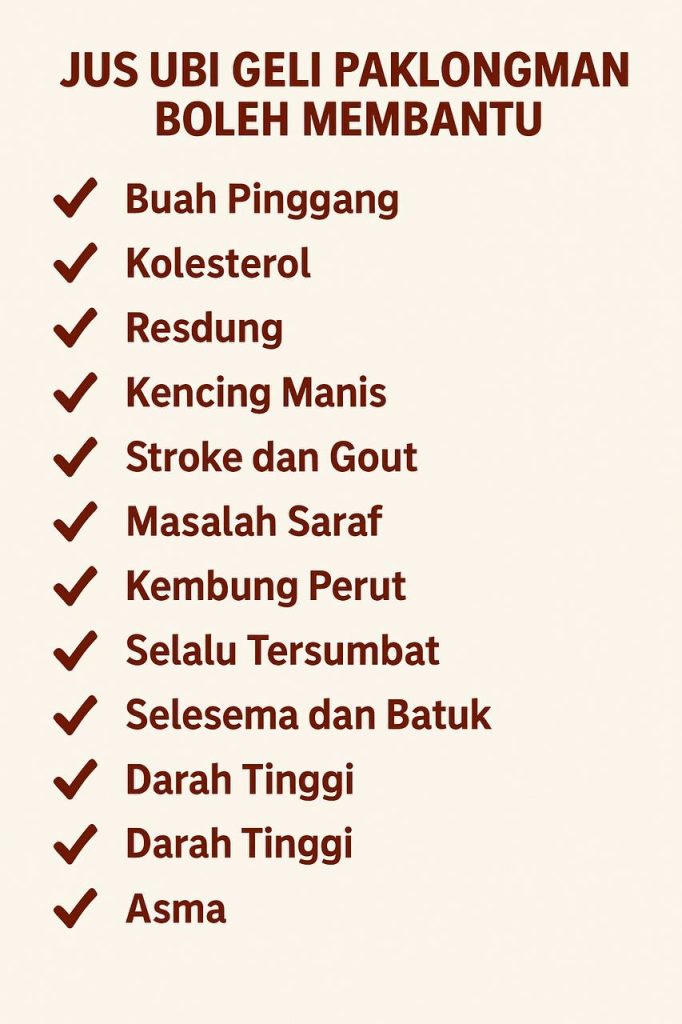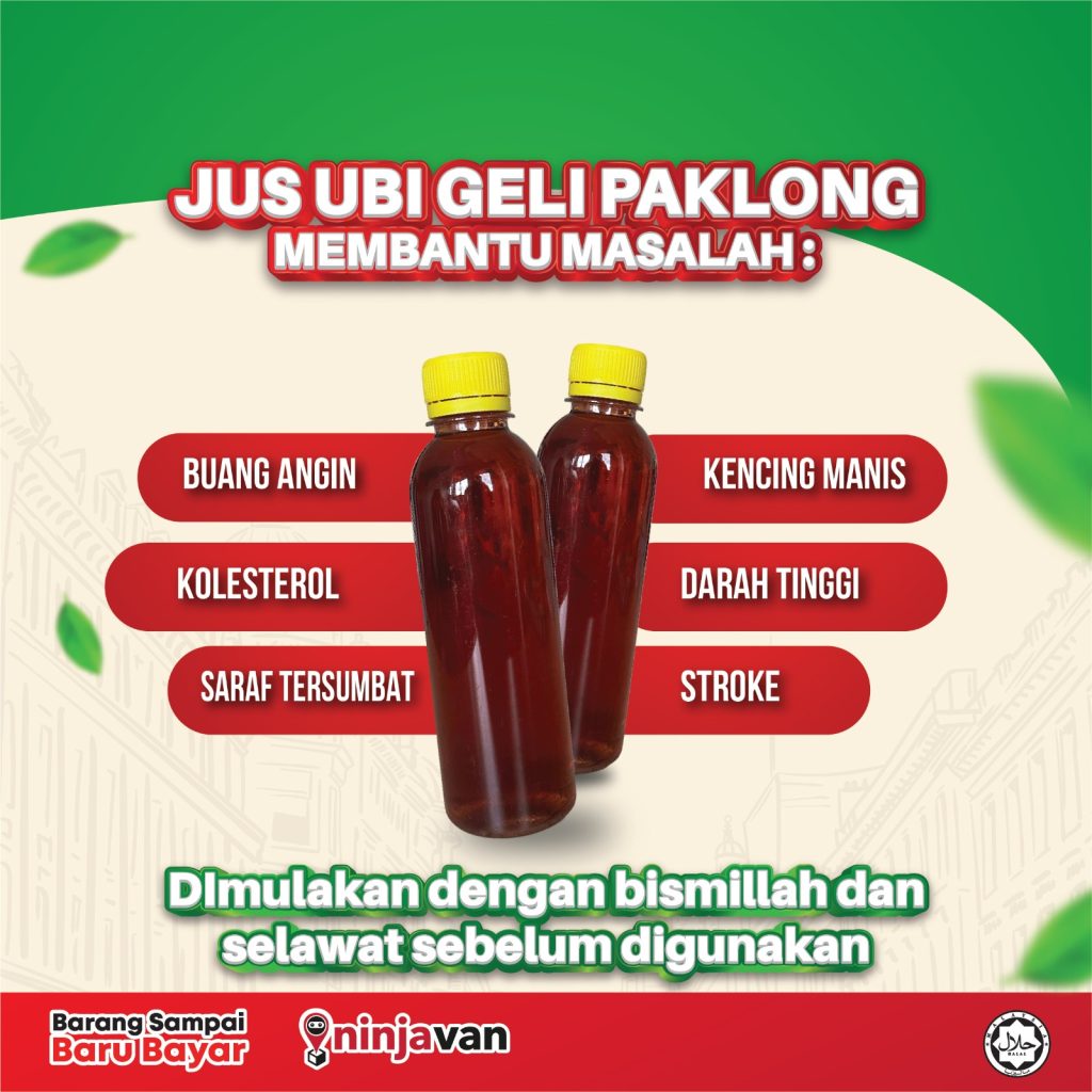 Jus Ubi Geli Paklongman dapat membantu masalah Buah Pinggang, Darah Tinggi, Asthma, Kencing Manis, Gout dan Sakit Sendi